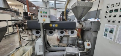 info prodotto- Estrusore monovite TPV 75LD22 - Banco portacalibro da 5 mt - Traino a 2 cingoli piani 1100 x 140mm, motore in c.c. - Taglierina PTV